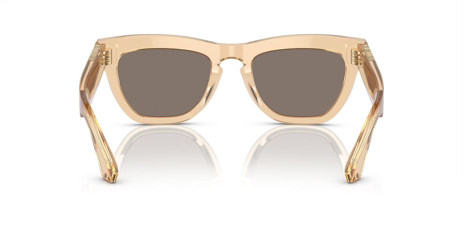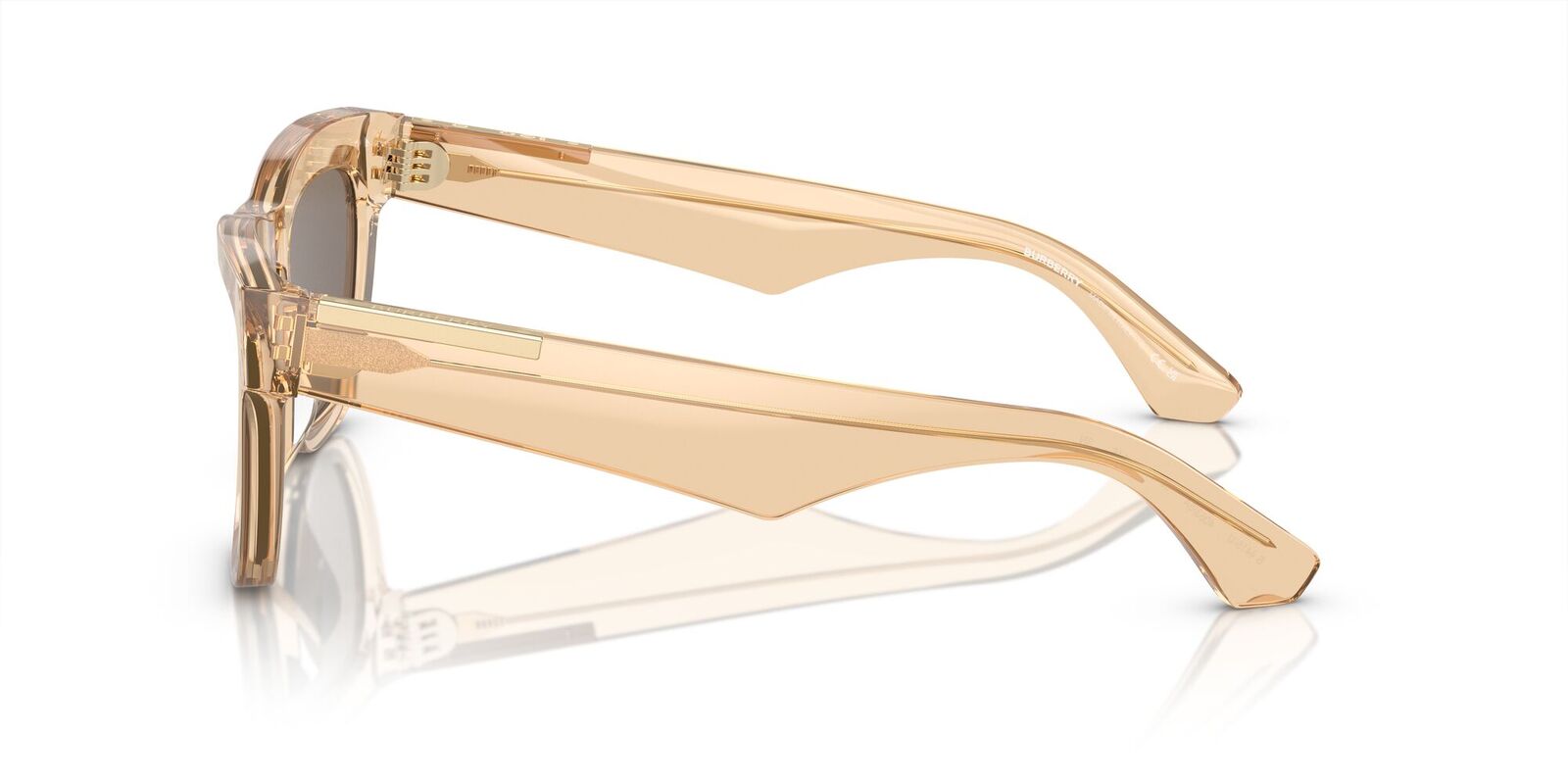 A pair of square-frame sunglasses in transparent acetate with sculptural temples. The polished metal hardware is engraved with the Burberry logo and hallmarks.