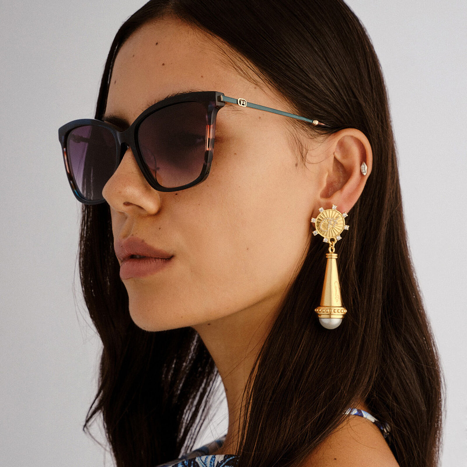 The Camilla Deep Sea Dive is a refined cat-eye frame that balances elegance and edge with its graceful, swooping angles. Designed for a medium fit, this handcrafted acetate style exudes sophistication, enhanced by luxurious metal temples adorned with Camilla’s signature CF iconography. Subtle contrast lamination detailing on the front frame and tips adds depth and distinction, giving the design a polished, contemporary allure.