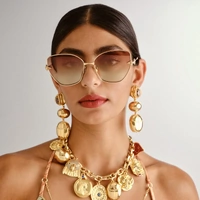 Inspired by worldly travel, DESERT REIGN features bespoke hardware that speaks to Egypt. Defined by feminine energy, DESERT REIGN cat eye sunglasses are medium in size and feature sweeping angles in a full metal construction. The hand-polished metal frame features textured temple hardware detailing and crystals inlaid at the lug and temple. These stunning shades are fitted with adjustable nosepads for a custom fit and CR-39 lenses for clarity, durability and sun comfort.