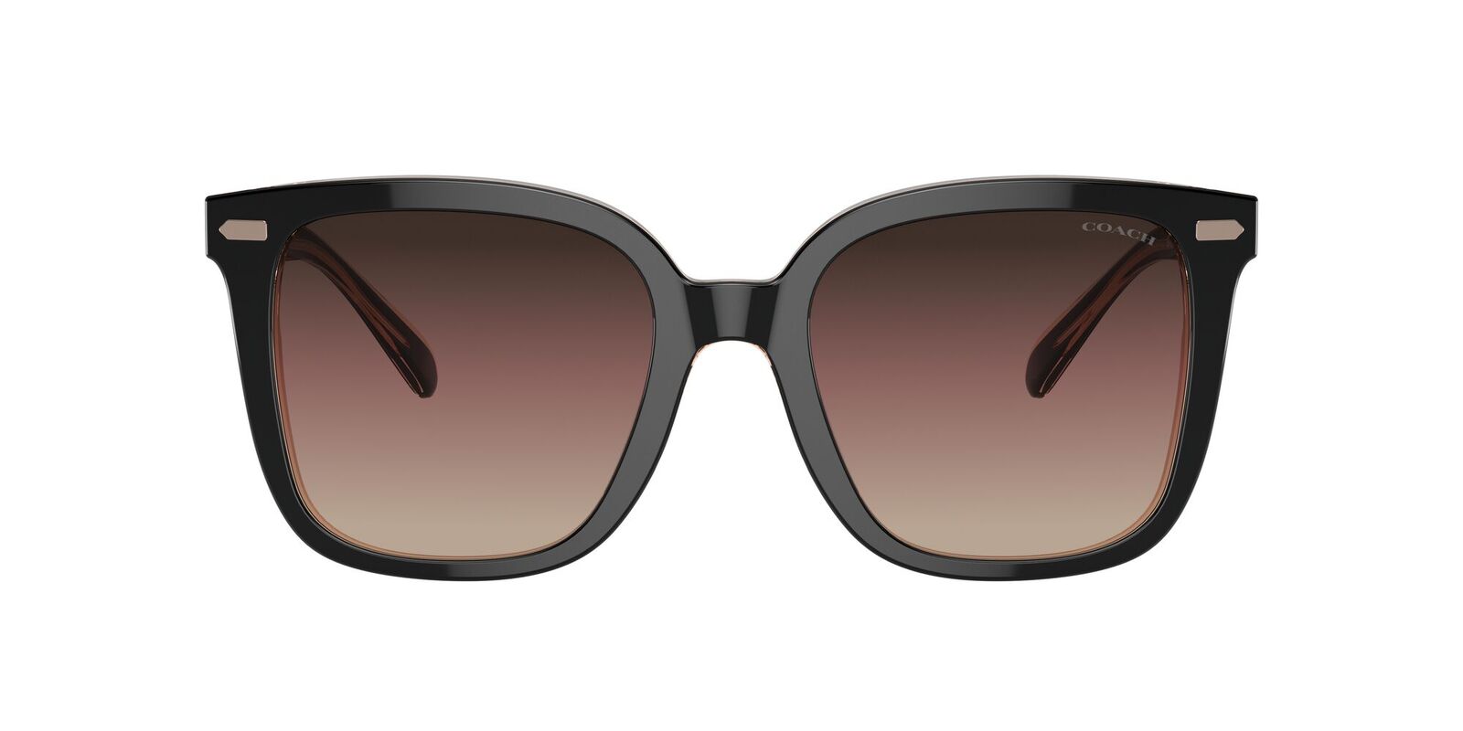 The Coach HC8381F sunglasses in Black with Violet Lenses offer a bold and stylish look with square lenses and a bi-colour acetate frame. Enhanced with metal rivets and a visible gold-tone metal core down the temples, these sunglasses seamlessly blend durability with high fashion. The Coach word mark on the temple tips adds a subtle yet distinctive touch, making these sunglasses a sophisticated accessory for any wardrobe.