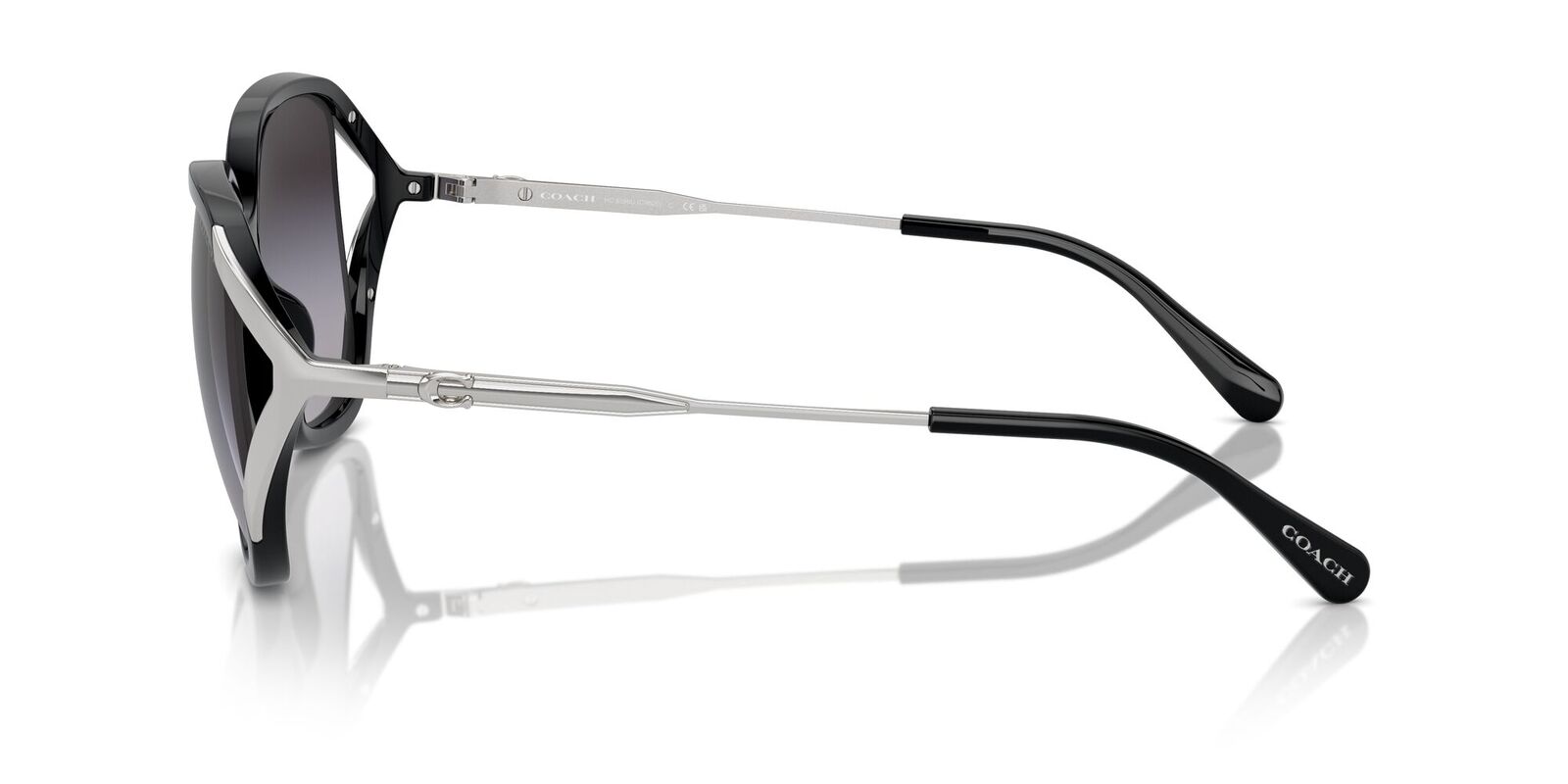 The Coach HC8396U sunglasses in Black with Grey Gradient Lenses embody glamour and sophistication. This oversized sun style features a striking forking detail on the temple, creating a bold silhouette that demands attention. The lightweight injected frame gently curves towards the metal temples, crafting a feminine shape that flatters any face. Inspired by legendary Coach jewellery, the galvanic finished temples boast the iconic Sculptural C logo. Perfect for those who appreciate elegance with a hint of edginess, these sunglasses are the epitome of modern chic.