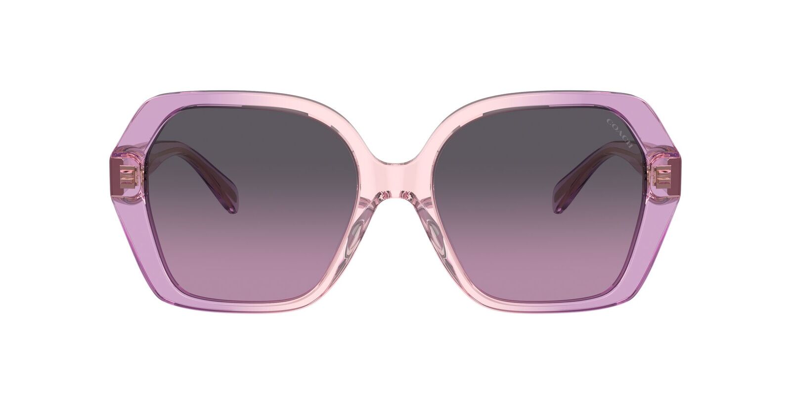 The Coach HC8404U sunglasses in Amethyst w Pink Gradient with Purple Gradient Lenses offer a playful and contemporary look. These sunglasses feature an oversized, geometric frame while the east-to-west cool gradient acetates highlight the sophisticated design. The embedded Signature C pattern down slim temples amplifies this modern sun style, adding a touch of luxury and elegance. Perfect for those who love to express their unique sense of style, these sunglasses are sure to elevate any ensemble.