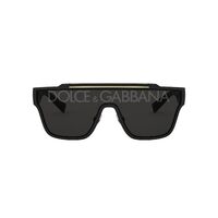 The Dolce & Gabbana DG6125 showcases a bold, D-frame shape with a gold-tone metal inlay along the brow bar. Wide temples feature the understated Dolce&Gabanna Lettering Logo while a single, dark grey lens proudly displays their branding along the brow line.