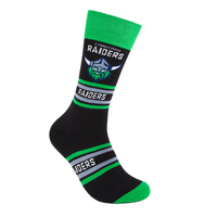 Unleash your inner Raider with these bold Canberra Raiders striped socks, designed in the teams signature black, green, and grey colourway. Crafted from premium organic cotton, they provide ultimate comfort, breathability, and durability, perfect for game days, workouts, or casual wear. The cushioned footbed and ribbed cuff ensure a secure fit, allowing you to showcase your Raiders pride with confidence wherever life takes you.