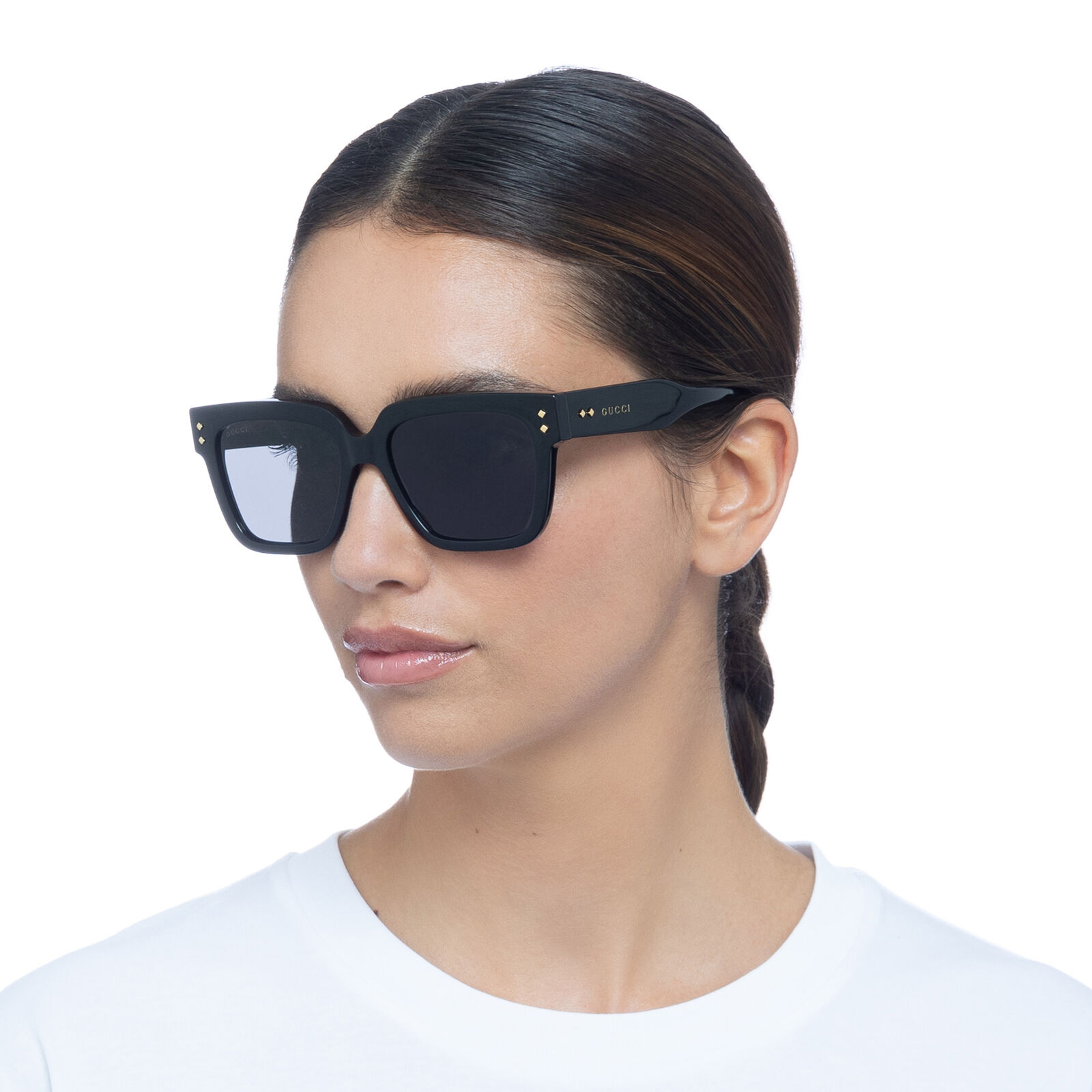 The Gucci GG1084S sunglasses showcase a bold square silhouette defined by sharp angles and clean, structured lines. Designed with a pared-back aesthetic, this style delivers a cool, contemporary look that balances simplicity with strong visual impact. Crafted from premium acetate, the frame offers confident proportions and a refined finish for everyday wear. The temples are finished with the Gucci lettering logo, adding a signature touch that reflects the brand's iconic heritage and modern design approach.
