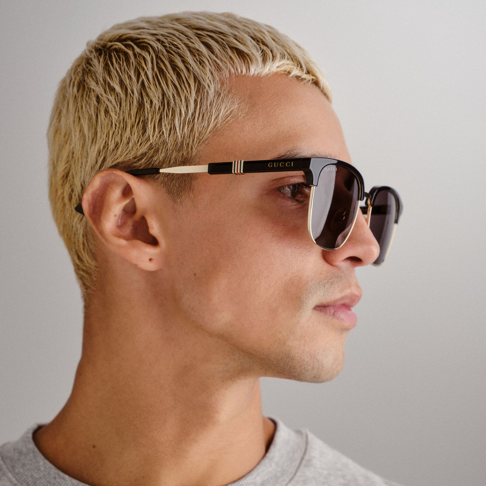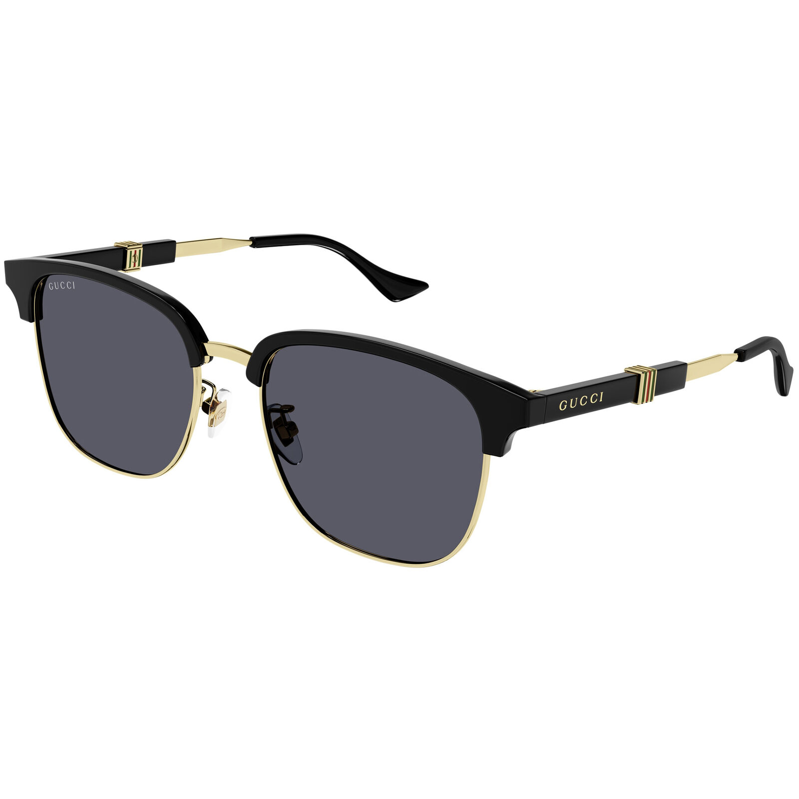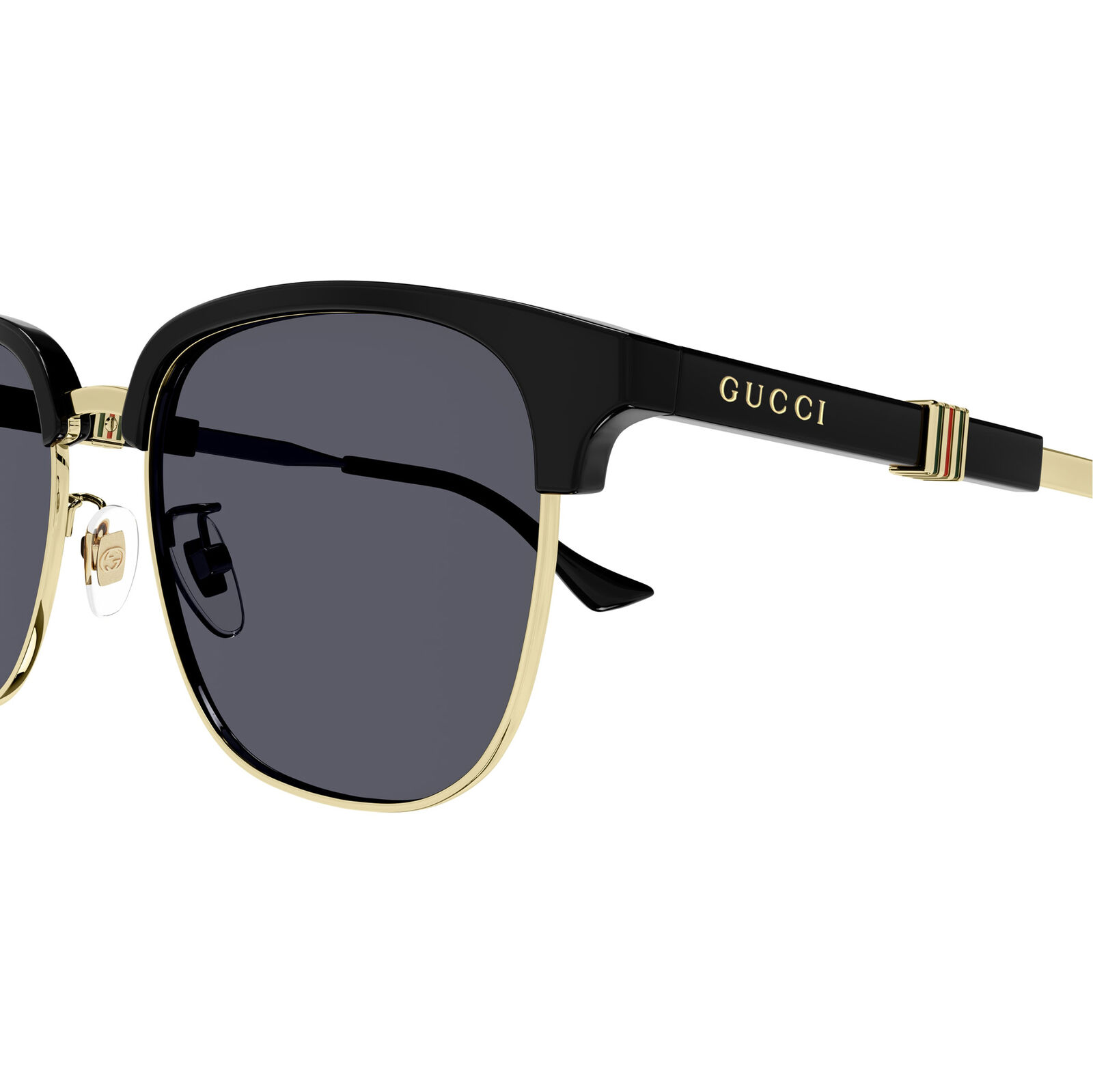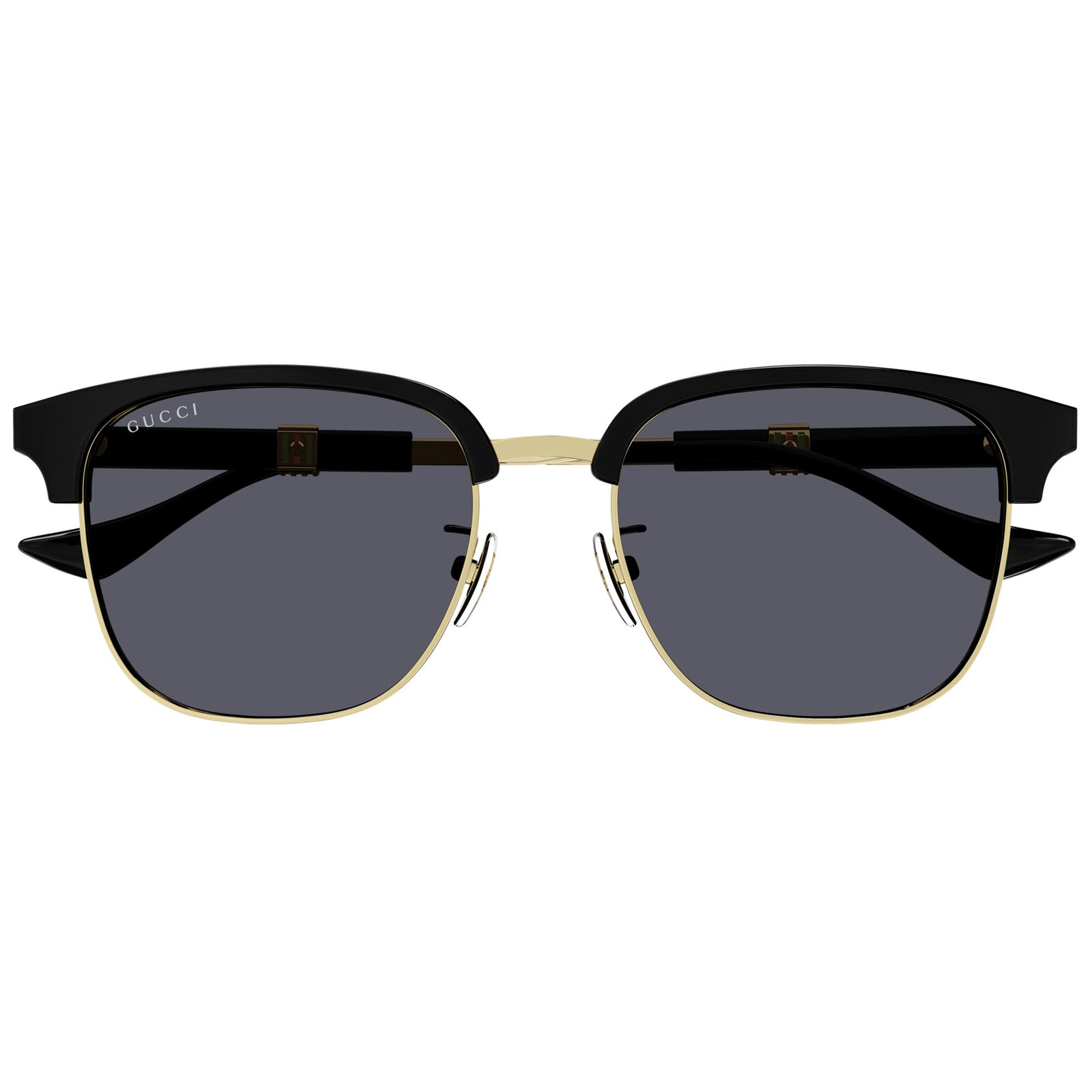 Inspired by vintage archive styling, the Gucci GG1499SK sunglasses introduce a Running Web concept with an enameled metal insert at the centre of the temple. The Clubmaster shape combines acetate and metal for a refined, masculine look that feels classic and contemporary at once. A lasered Gucci lettering logo adds a subtle signature detail, while the overall design keeps the frame polished and versatile. Presented in premium Gucci packaging with a case and cleaning cloth, this is a sophisticated interpretation of a heritage-inspired style. The mix of textures gives it strong visual appeal.