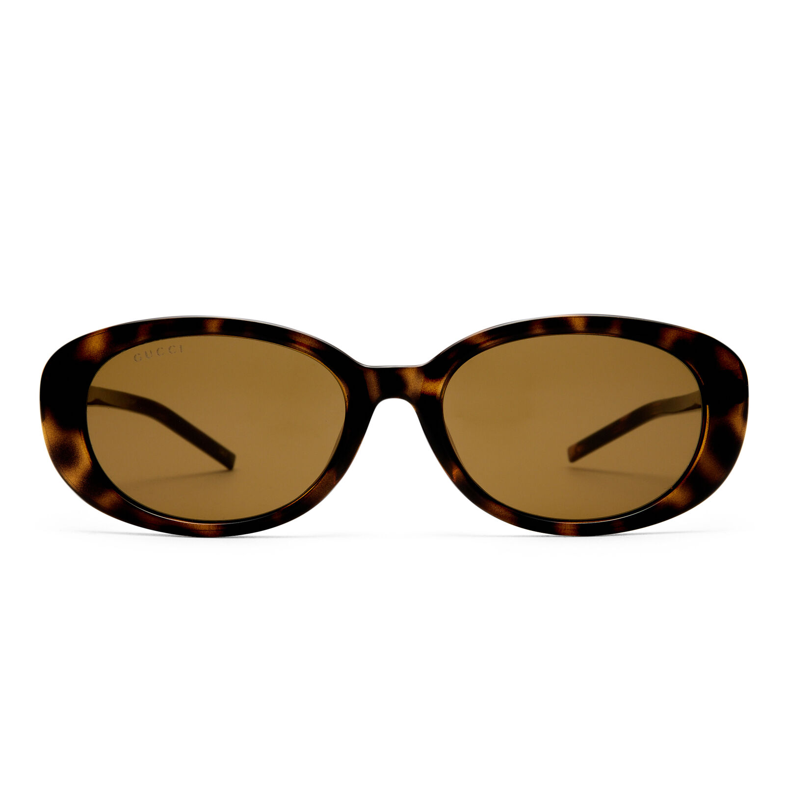 Narrow plastic shapes with a 90s look and feel are elevated through a unique G squared logo on the temple. The oval cat-eye silhouette is inspired by the eras sharper feminine styling, while the injected construction keeps the frame light and easy to wear. A solid feminine palette and strassed logo options bring added fashion appeal and a playful sense of detail. Presented in premium Gucci packaging with a case and cleaning cloth, the GG1684SA is a bold yet wearable statement frame. Its rounded shape softens the look while keeping it contemporary.
