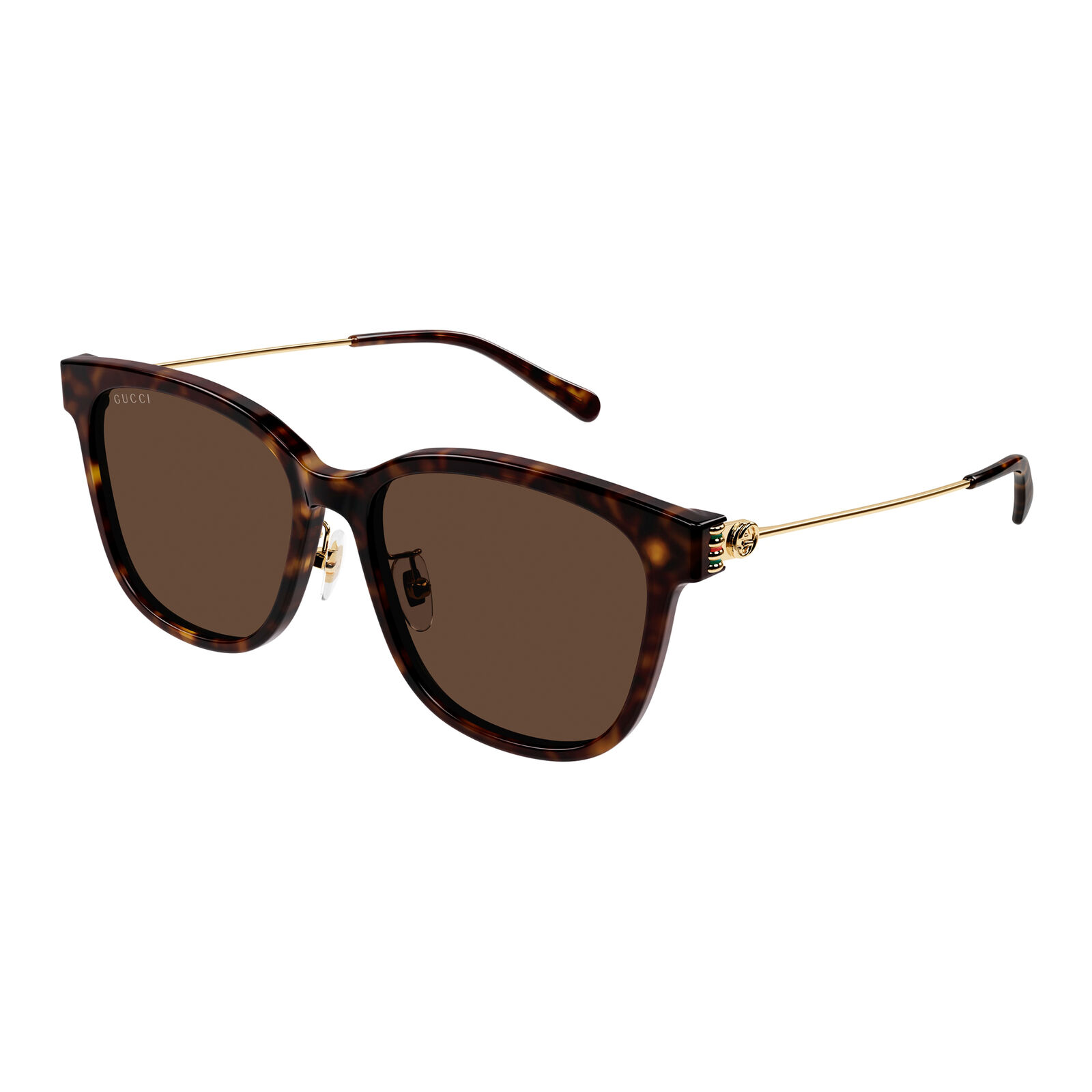 The Gucci GG1884SK sunglasses showcase an oversized square cat-eye silhouette that combines bold proportions with feminine elegance. The combi construction enhances the design, creating a refined yet contemporary aesthetic. The temples are detailed with the interlocking GG logo and subtle Web accents, adding a distinctive brand signature. Designed with a Korean fit, this model ensures comfort alongside its striking appearance. Its strong shape gives it a polished, fashion-led finish.