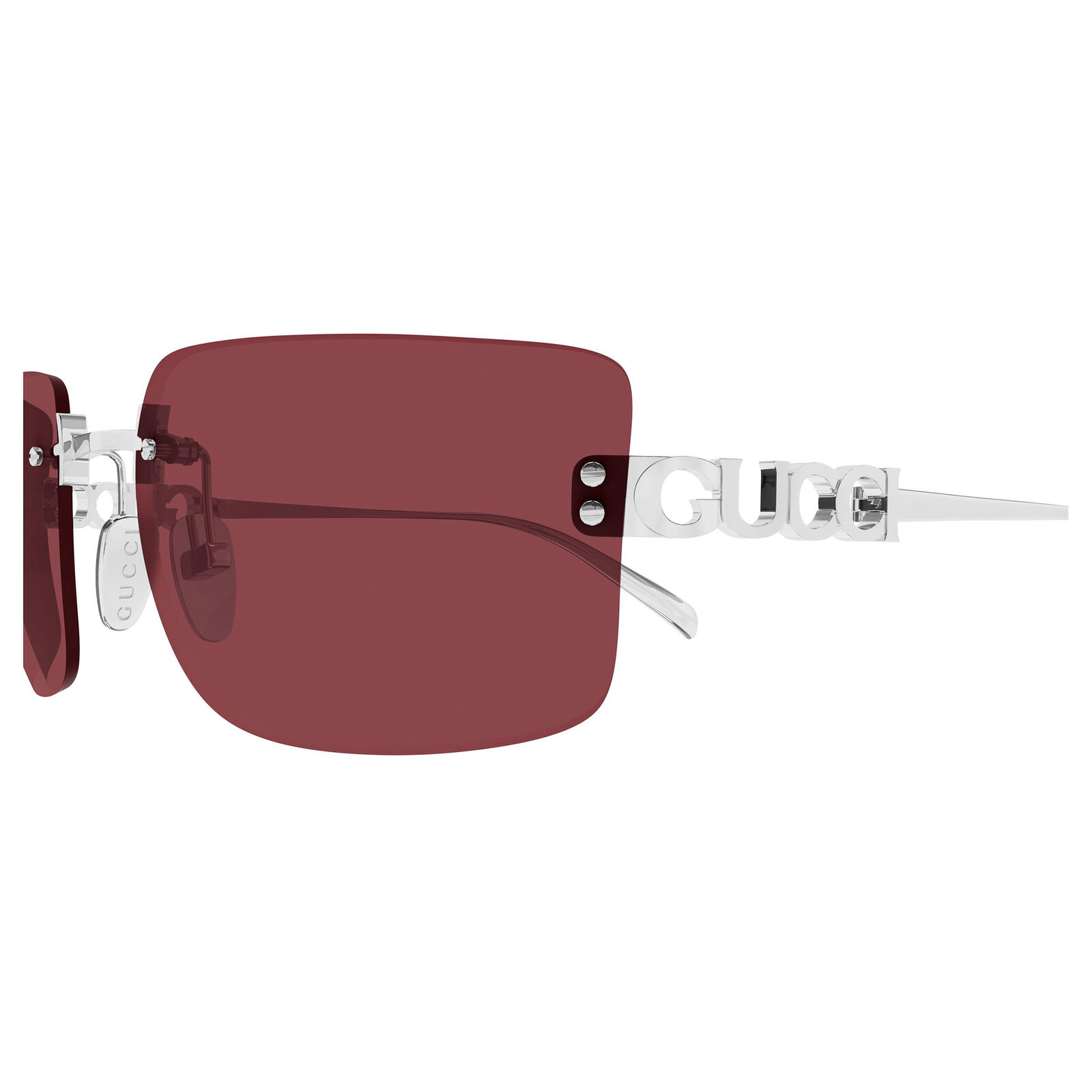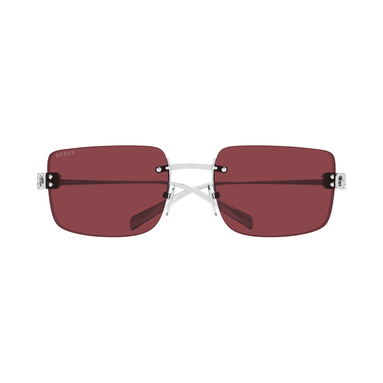 The Gucci GG2038S sunglasses feature a distinctive rimless-inspired construction with a rectangular silhouette that delivers a vintage-inspired yet modern look. The lightweight design enhances comfort while maintaining a refined aesthetic. A cut-out metal logo detail on the temples adds a unique signature element, elevating the overall design. This model combines classic inspiration with contemporary styling for a versatile finish. Its streamlined build gives it a clean, airy feel.