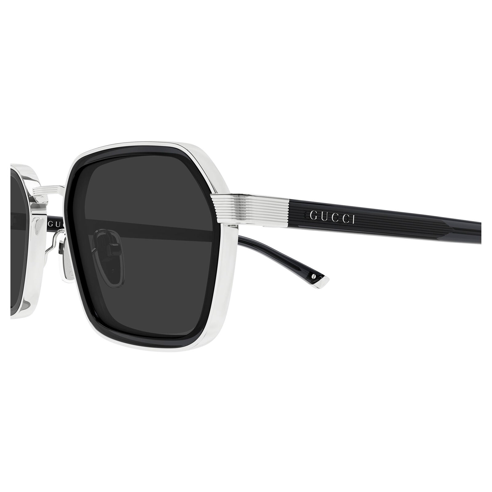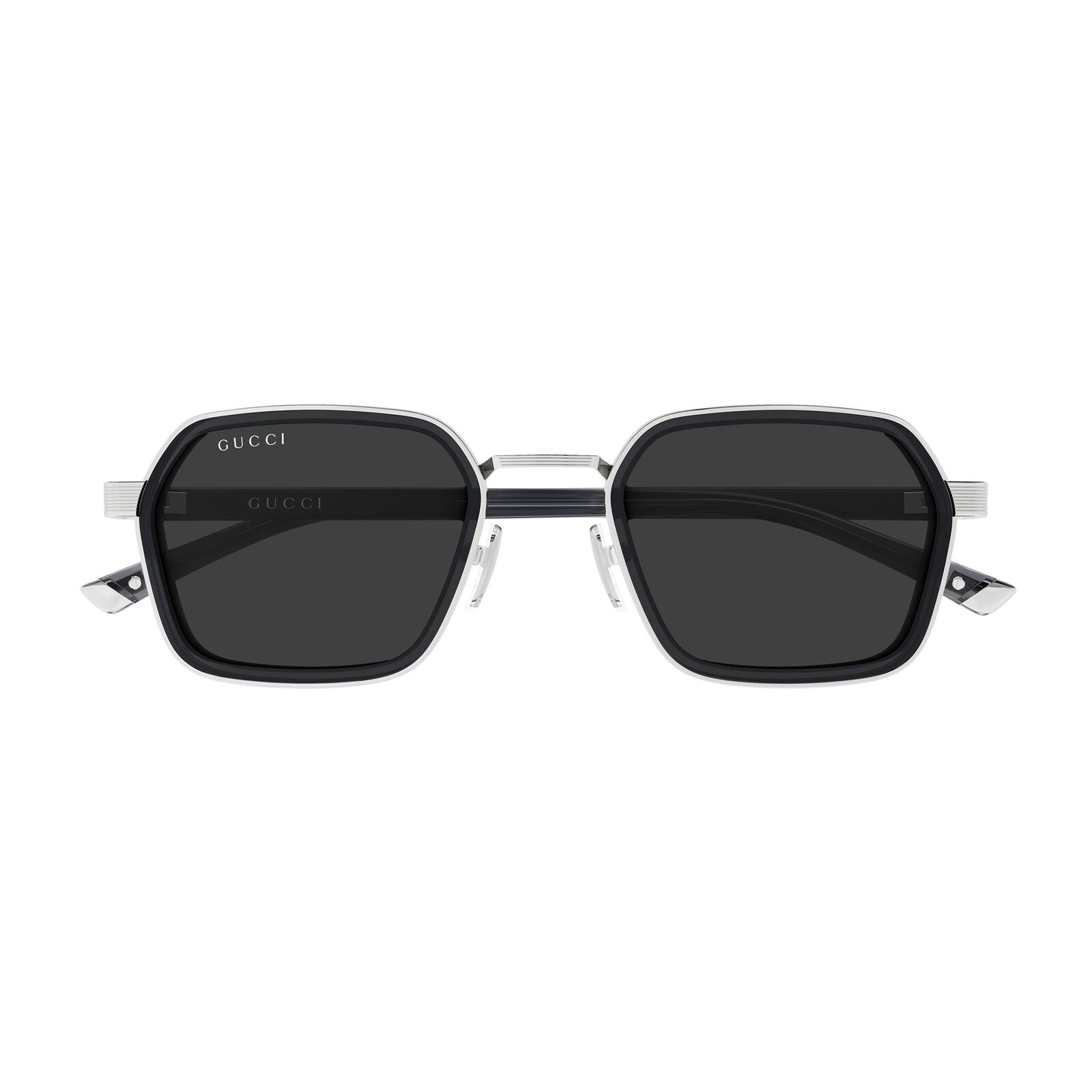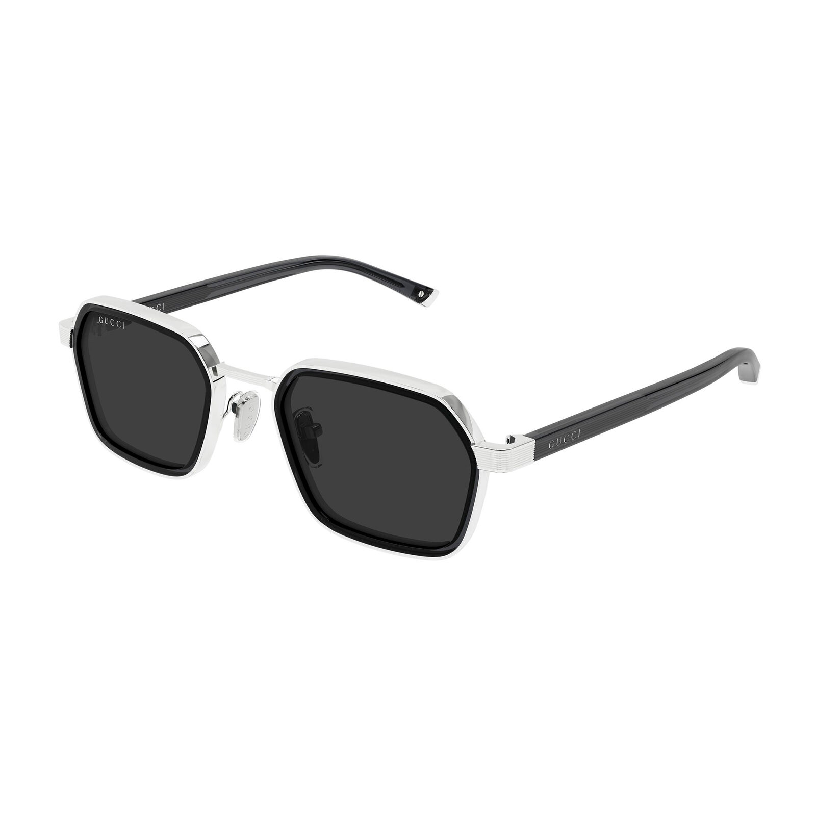 The Gucci GG2074S is a luxurious square-framed sunglasses style for men, characterised by a double-construction design that combines acetate and metal. Made in Italy, it has a bold aesthetic that feels both contemporary and refined. Adjustable nose pads add comfort, while the Gucci logo on the temples provides a clear signature finish. This model offers a strong, premium look with versatile everyday wearability. Its compact shape gives it a clean, masculine edge.