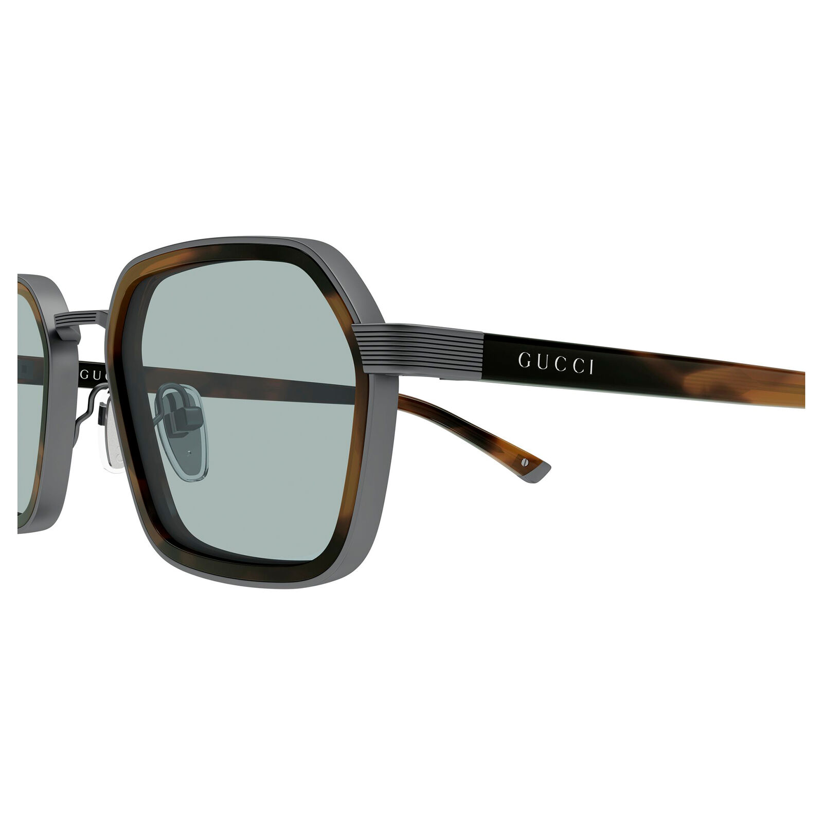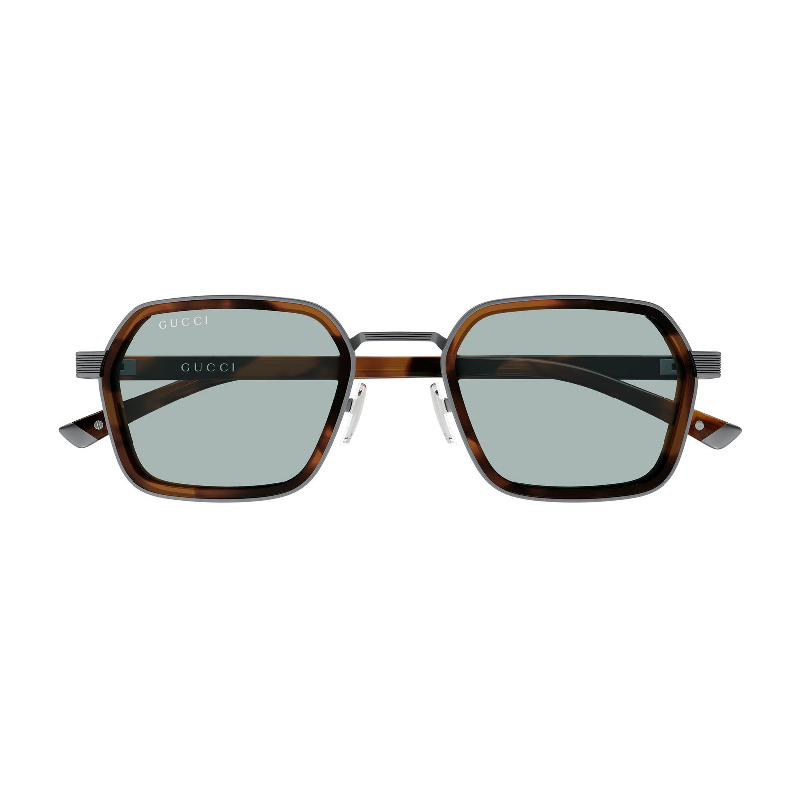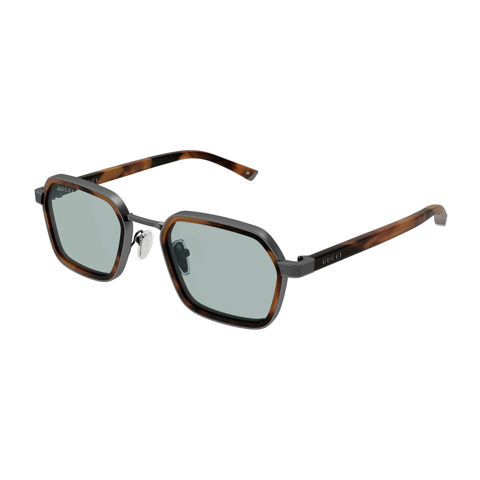 The Gucci GG2074S is a luxurious square-framed sunglasses style for men, characterised by a double-construction design that combines acetate and metal. Made in Italy, it has a bold aesthetic that feels both contemporary and refined. Adjustable nose pads add comfort, while the Gucci logo on the temples provides a clear signature finish. This model offers a strong, premium look with versatile everyday wearability. Its compact shape gives it a clean, masculine edge.