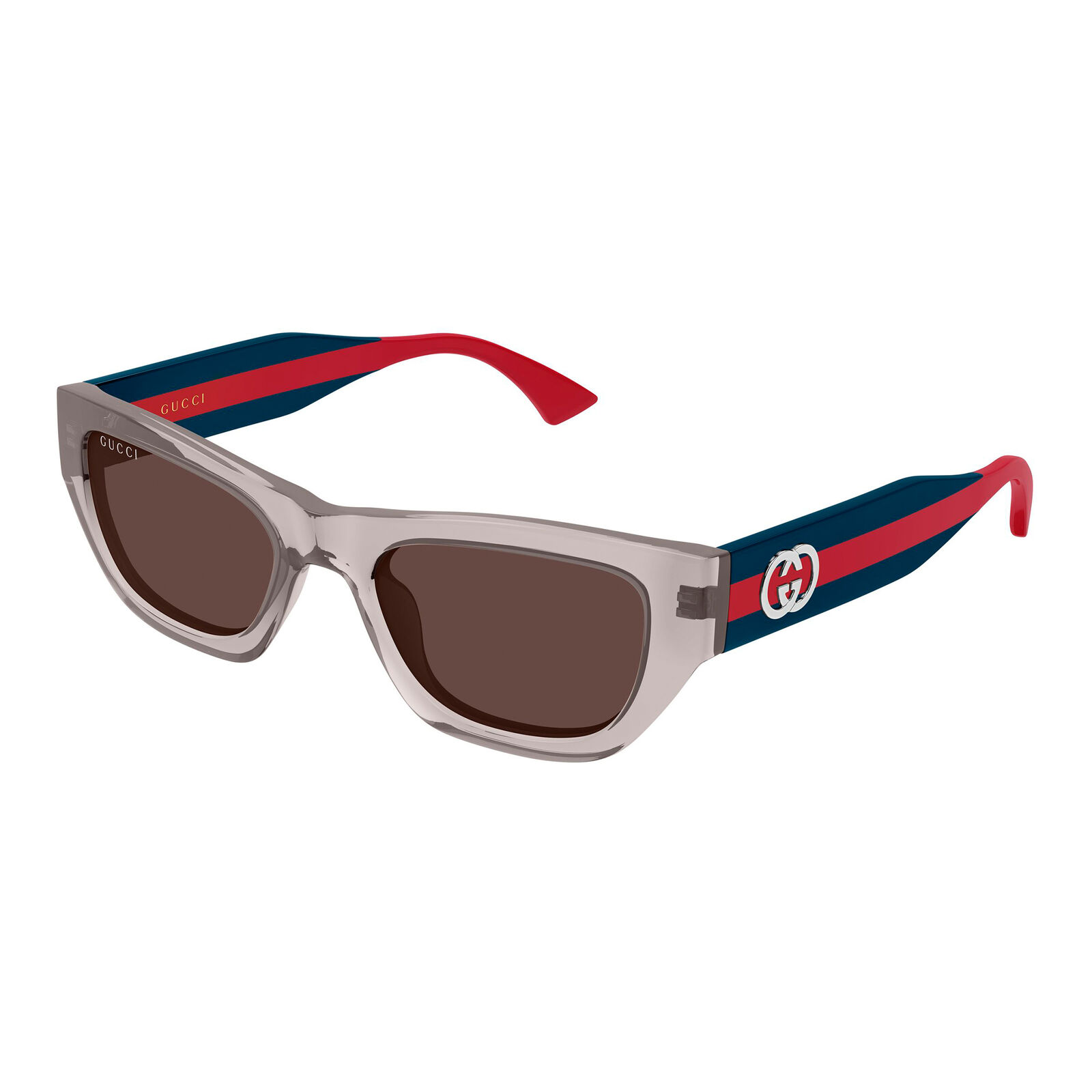 Iconic new pop web concept detailing on the temples gives the Gucci GG2116S a strong and instantly recognisable identity. The rectangular cat-eyed shape and mid temple height create a confident silhouette with a feminine edge. Interlocking G branding and the coloured stripe detailing reinforce the frame's distinctive Gucci character. Presented in premium Gucci packaging with a case and cleaning cloth, this model feels polished, modern and expressive. Its shape gives it a sleek and contemporary finish.