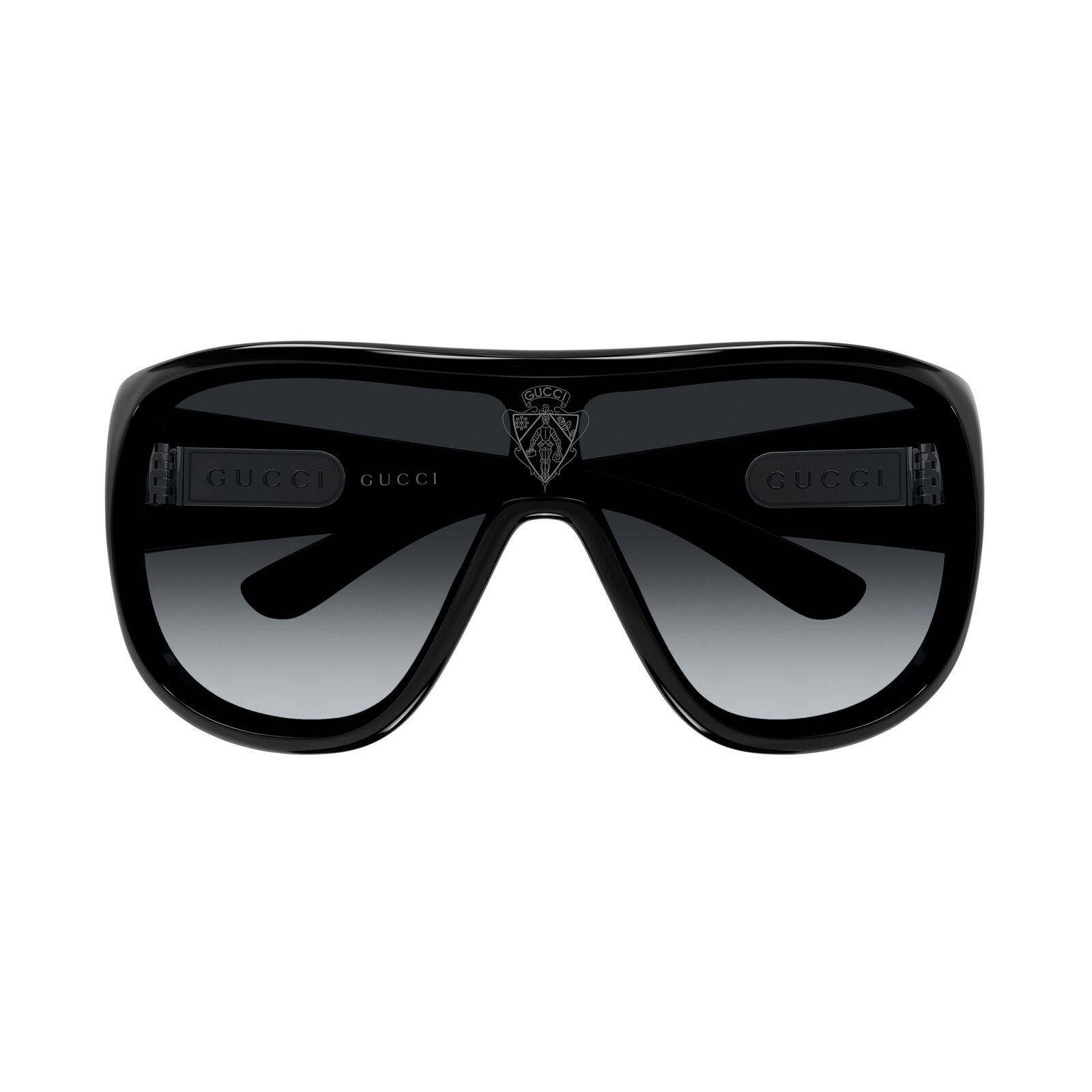 The Gucci GG2168S is a bold sport-luxe mask-style sunglasses model featuring a futuristic rectangular wrap-around design. The black injection frame and matching temples create a sleek, unified look, while the Gucci logo adds a clear branded finish. Its shield-like silhouette gives it strong visual impact and a distinctly contemporary feel. This model is made for standout styling with a modern, athletic edge. Its wrap-around shape gives it a sharp, dynamic profile.