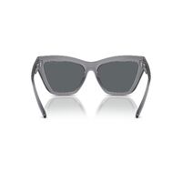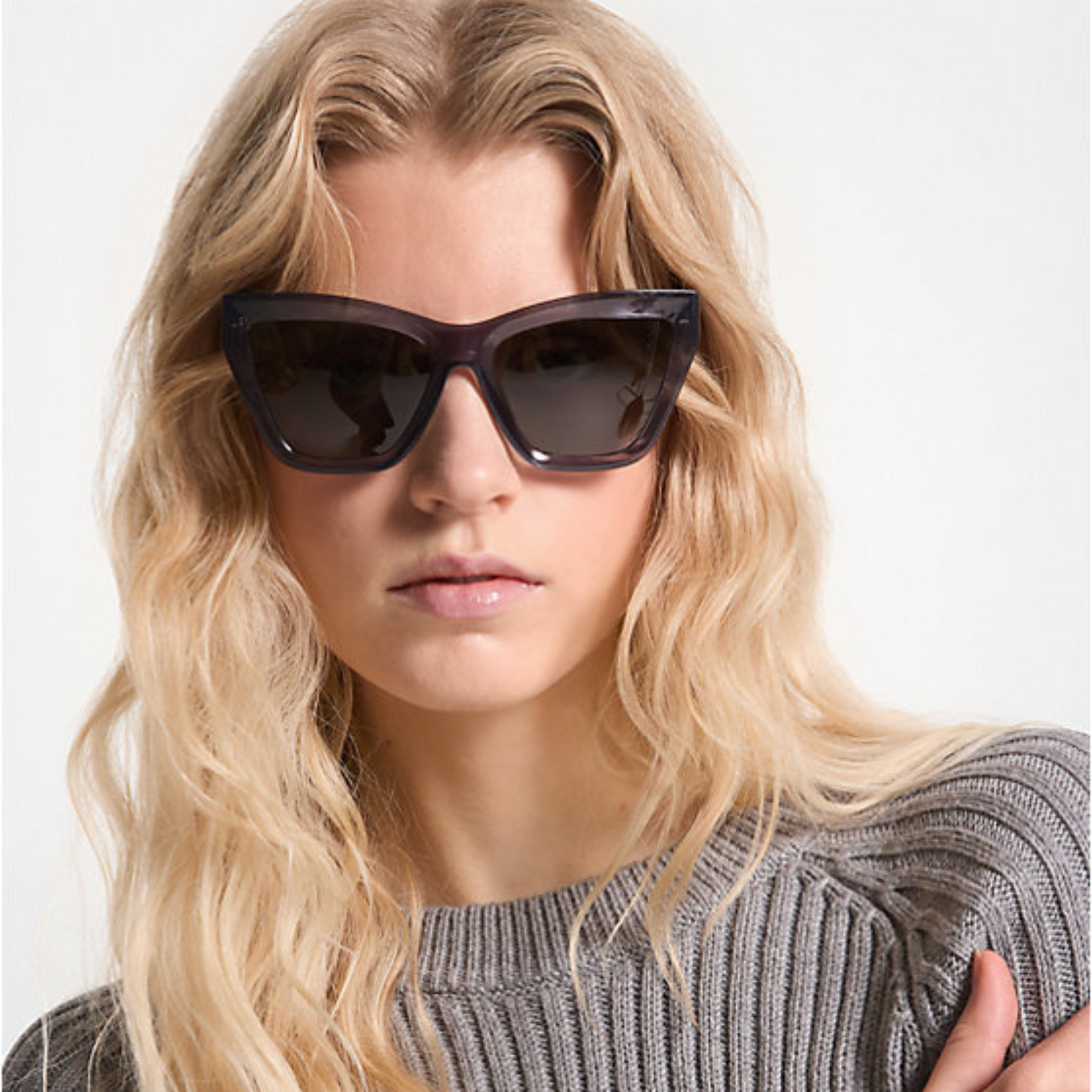 Introducing the Michael Kors Dubai sunglasses in transparent blue with dark grey Lenses, where modernity meets elegance. This squared cat-eye silhouette exudes contemporary chic with its feminine yet bold design.