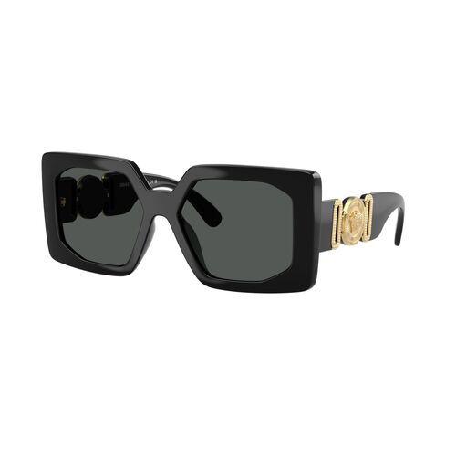 Recalling Versace’s best-seller, this style evokes the opulence of 90s music and fashion with original Biggie embellishments. Geometric shapes accentuate the oversized square frames in full injected material while the heritage Medusa medallion and metal decor in the original Biggie style amplify the statement temples. Bold, glamorous and unmistakably Versace.