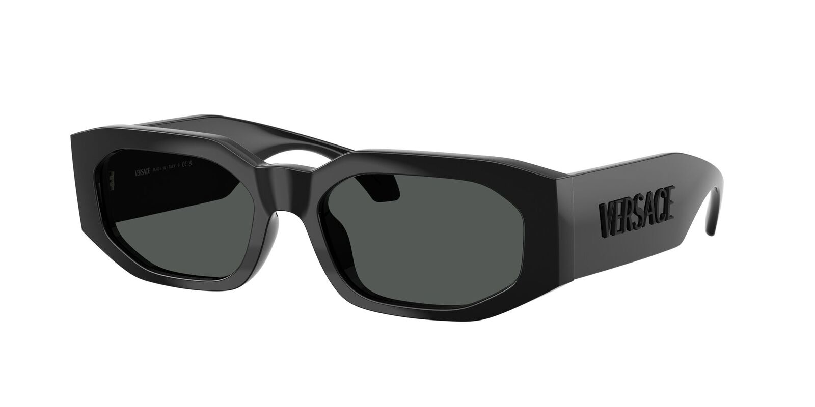 The Versace VE4489U sunglasses make a bold statement with their geometric design and powerful silhouette. Featuring a narrow, irregular front and wide, statement-making temples, these unisex frames exude modern confidence. Crafted from lightweight injected material for all-day comfort, they are finished with a striking 3D metal lettering logo, adding depth and signature Versace flair.